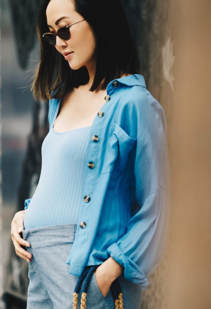 This trick is a lifesaver on hot summer days when I’m already in a swimsuit but need to transition into something more polished for an event or dinner. The solution? Simply throw on a pair of stylish maternity trousers (like these ultra-chic Ingrid trousers) and layer an oversized button-down shirt on top. It’s effortlessly chic and perfect for keeping cool while staying stylish.