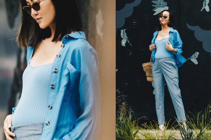 This trick is a lifesaver on hot summer days when I’m already in a swimsuit but need to transition into something more polished for an event or dinner. The solution? Simply throw on a pair of stylish maternity trousers (like these ultra-chic Ingrid trousers) and layer an oversized button-down shirt on top. It’s effortlessly chic and perfect for keeping cool while staying stylish.